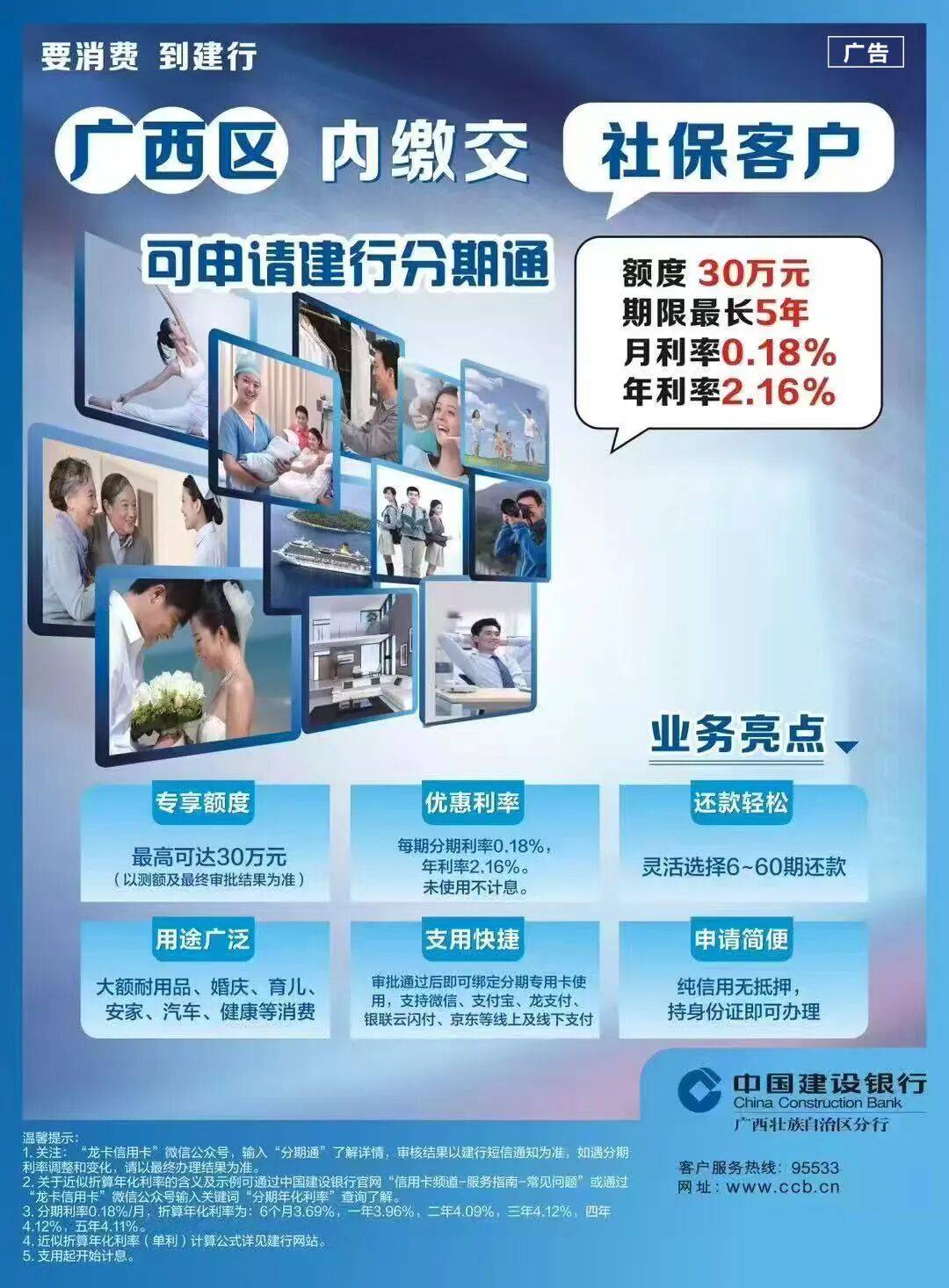 广西壮族自治区内缴交社保的客户,消费不期待,最长可申请84期,多种还款体例可选,优惠月费率低至0.15%、最高100万元专享额度,纯信用,建行“建易贷”,可申请建行社保版分期通,最长可达5年分期还款,纯信用无典质,申请便利!指定公积金缴交客户专享消费贷款,额度高,免典质,